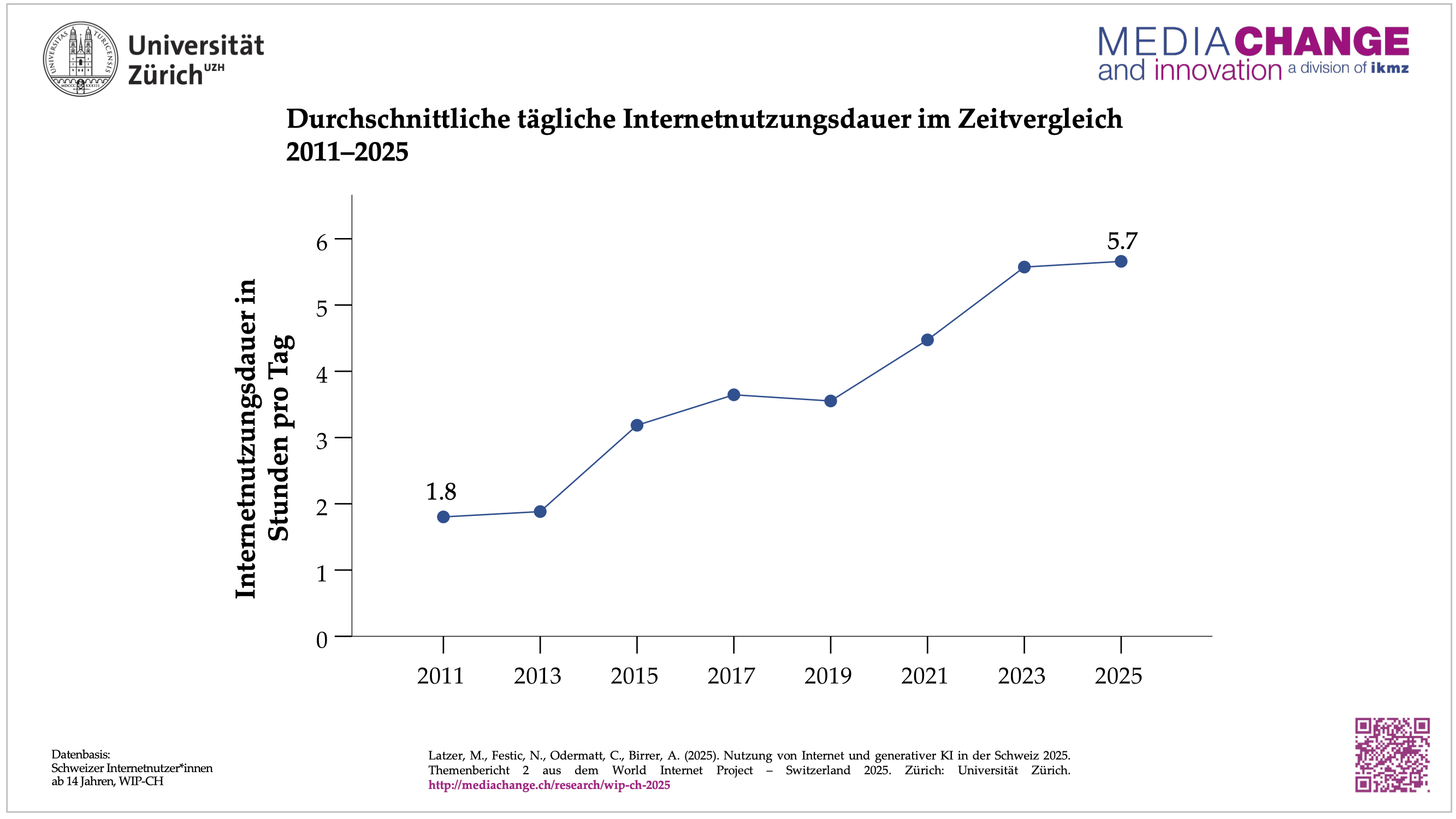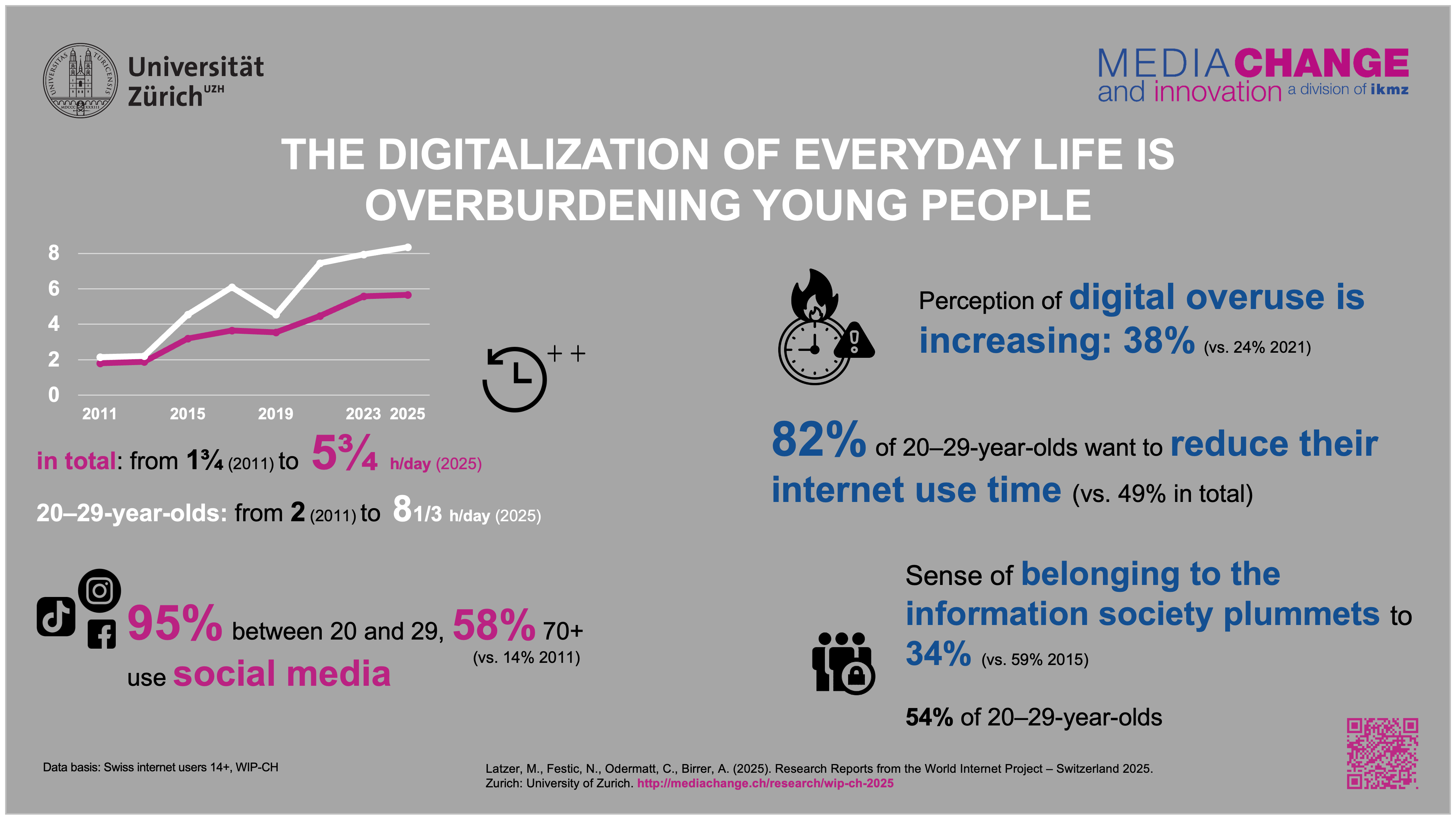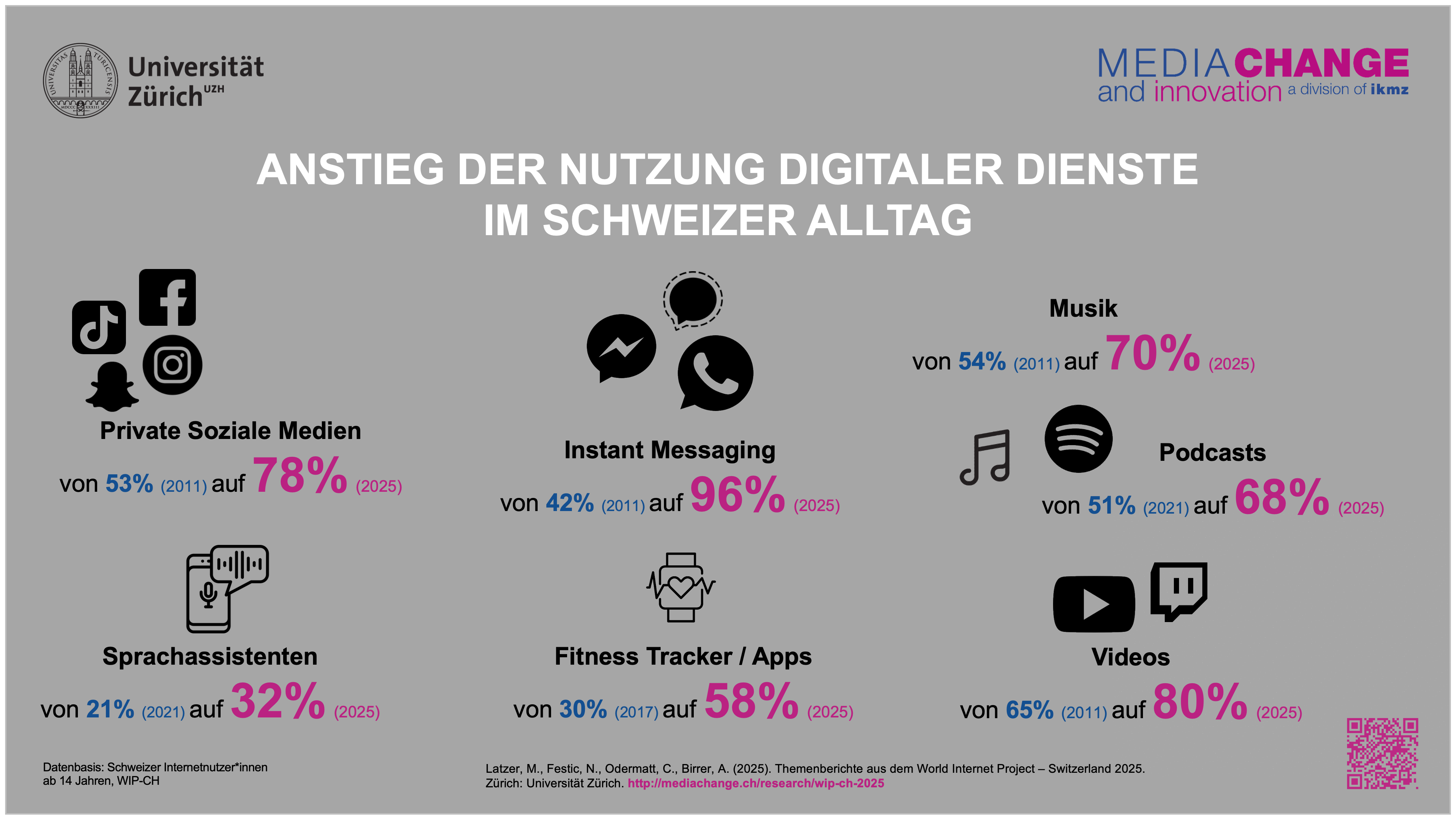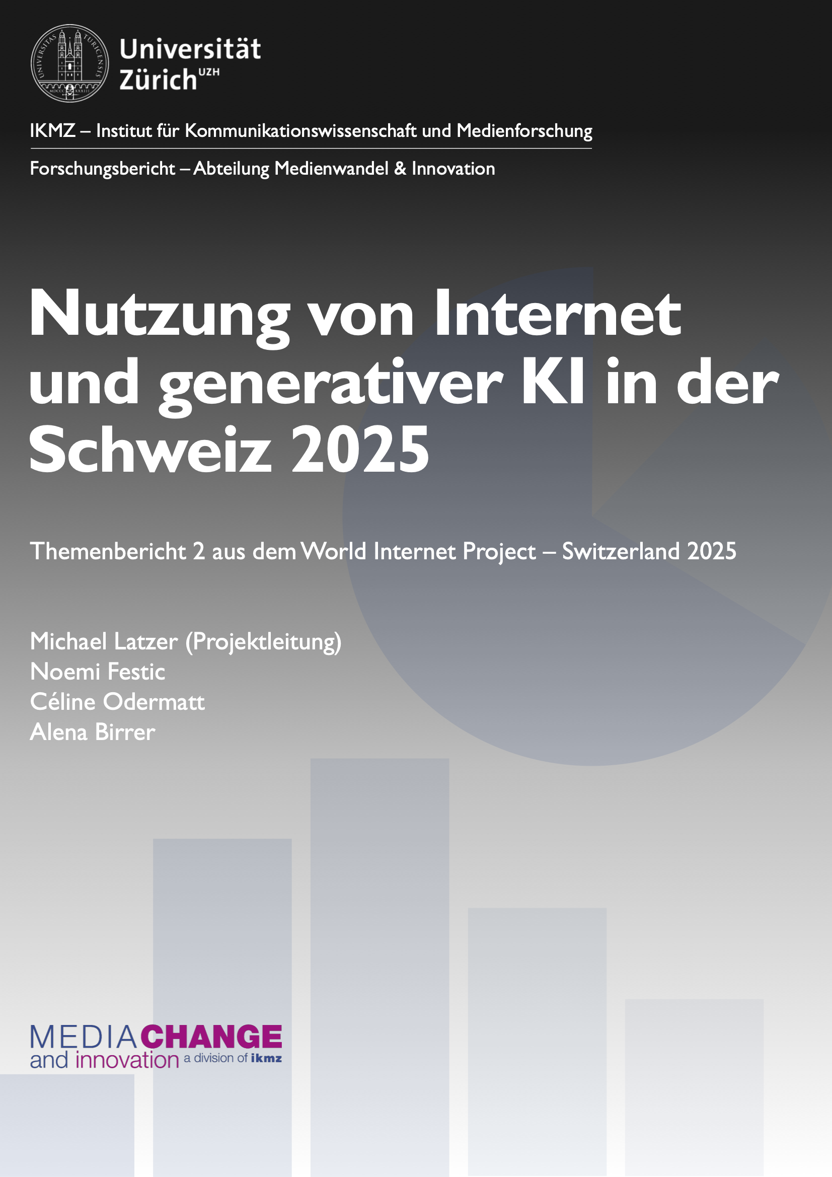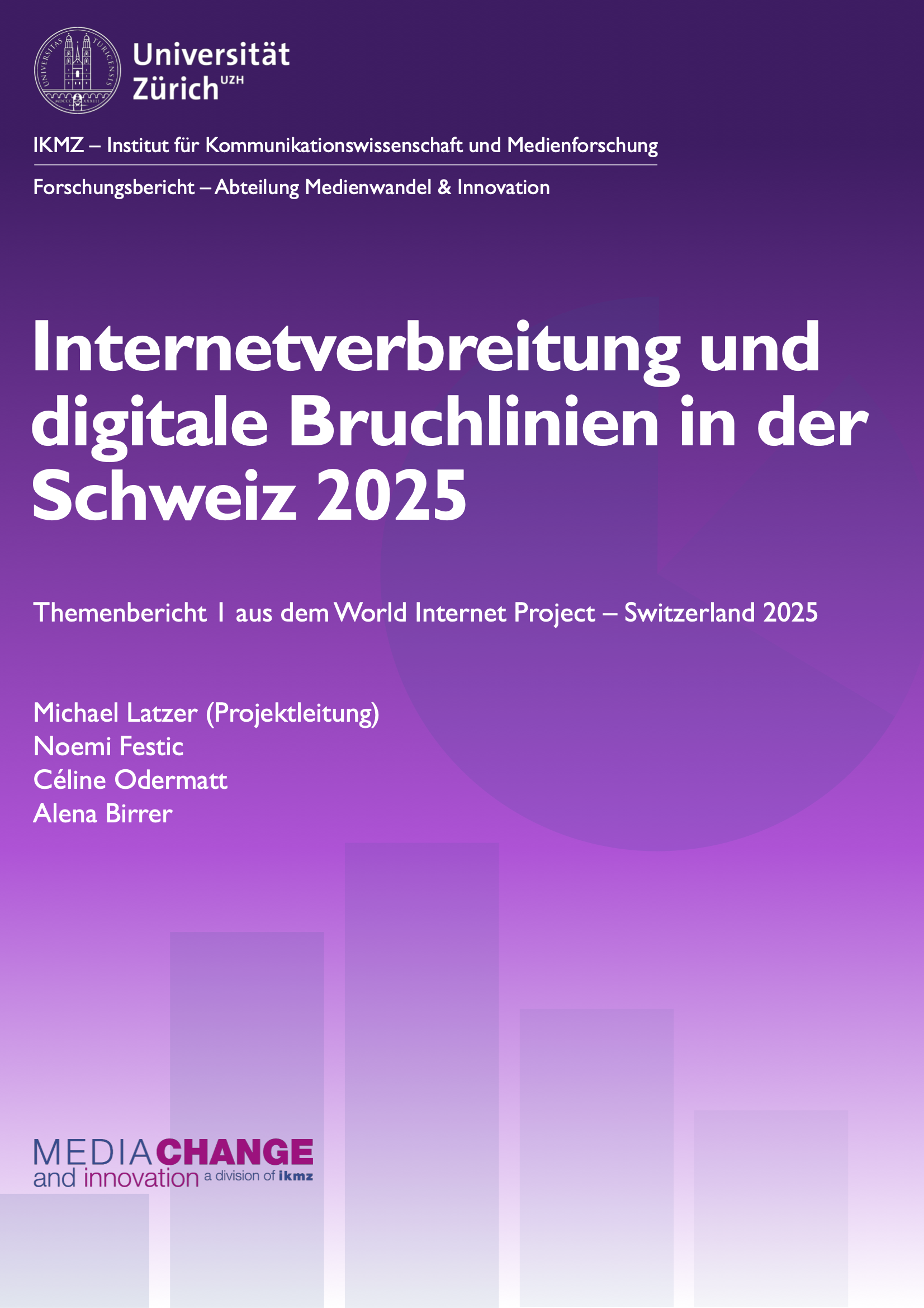 e Media Change & Innovation Division is the Swiss country partner of the World Internet Project (WIP). This international, collaborative project is looking at the social, political and economic impact of the Internet and other new technologies. The project started in 1999 and is chaired by Prof. Jeff Cole from the Annenberg School Center for the Digital Future, University of Southern California (USC), Los Angeles. The consortium includes more than 25 partners in countries and regions all over the world. The WIP conducts detailed, international comparative longitudinal studies on the use and impact of the Internet, publishes national and international reports and holds annual conferences. Results of the WIP-CH 2025 are based on an online survey with a representative sample of Swiss internet users aged 14 and over.