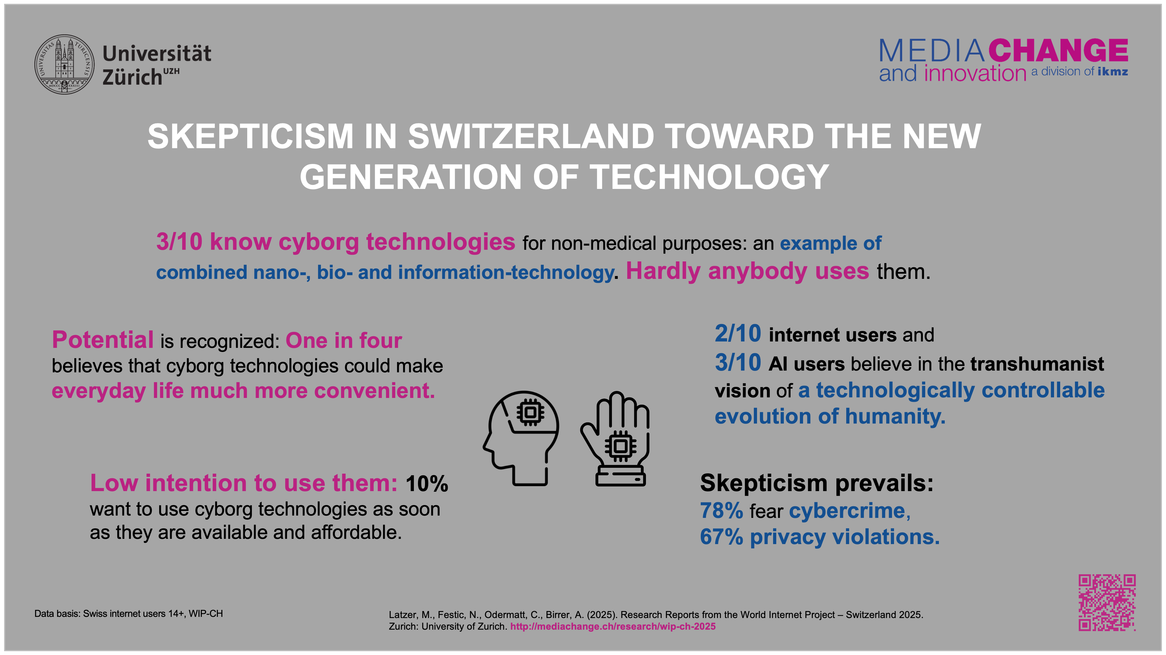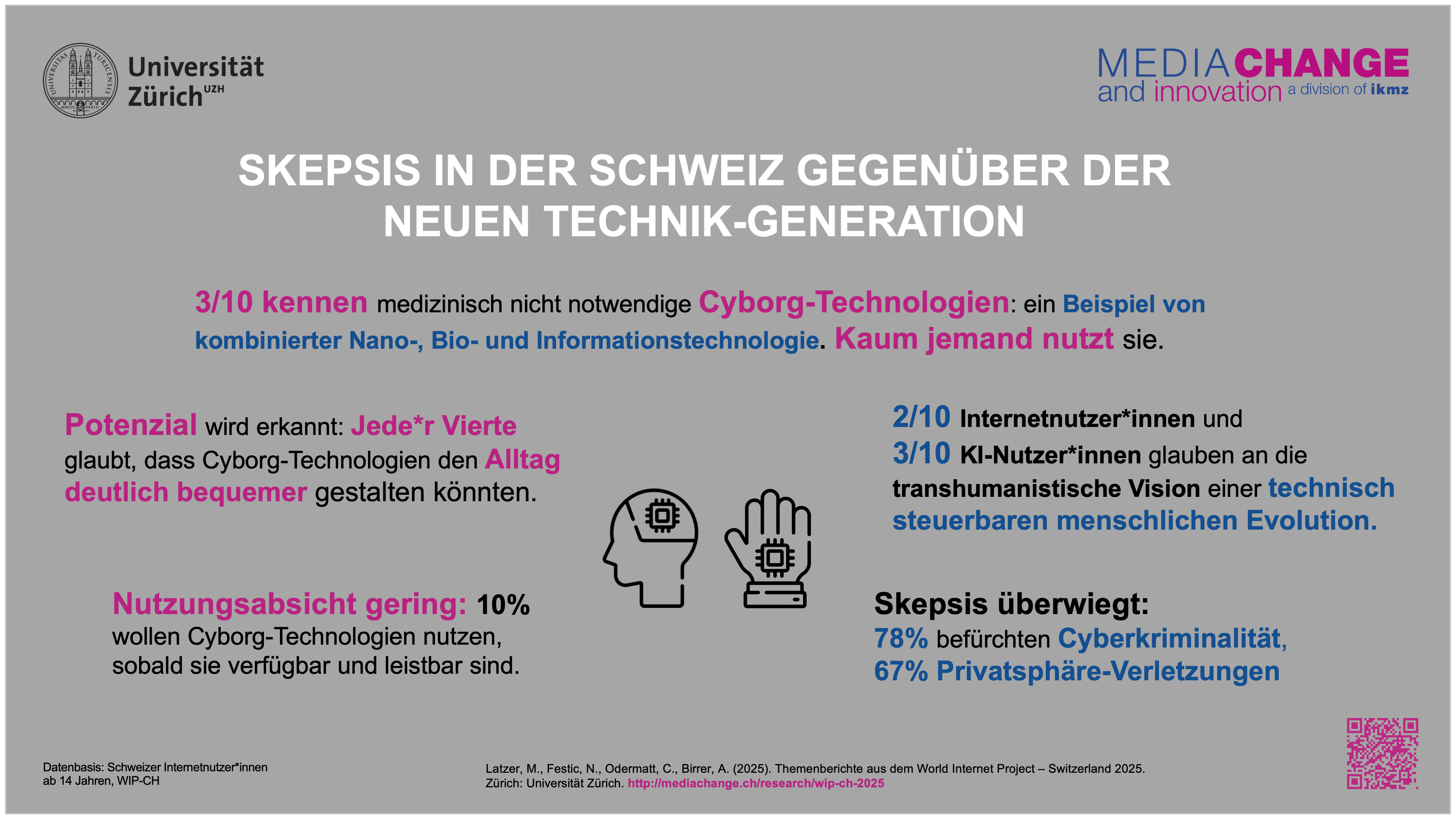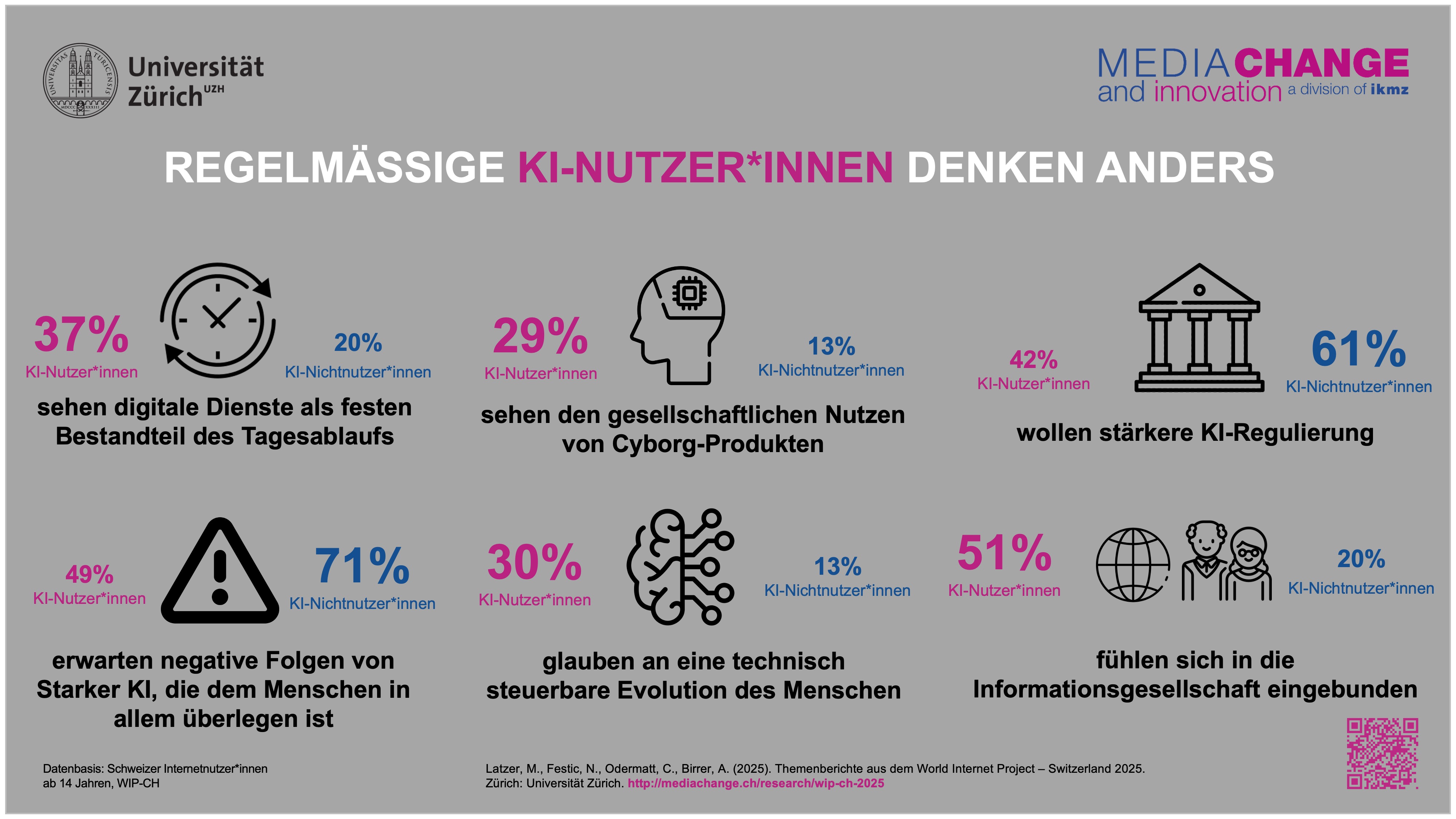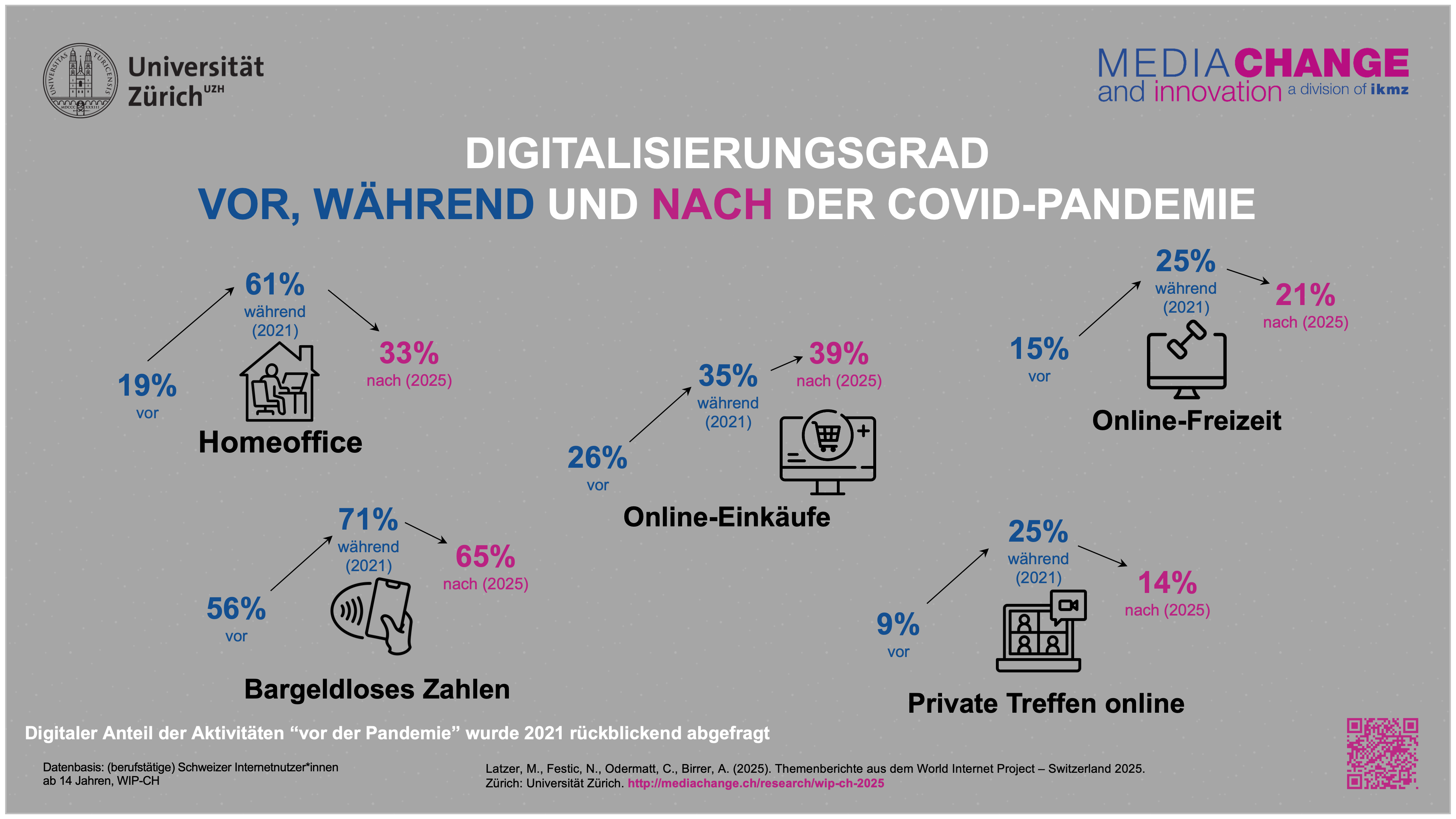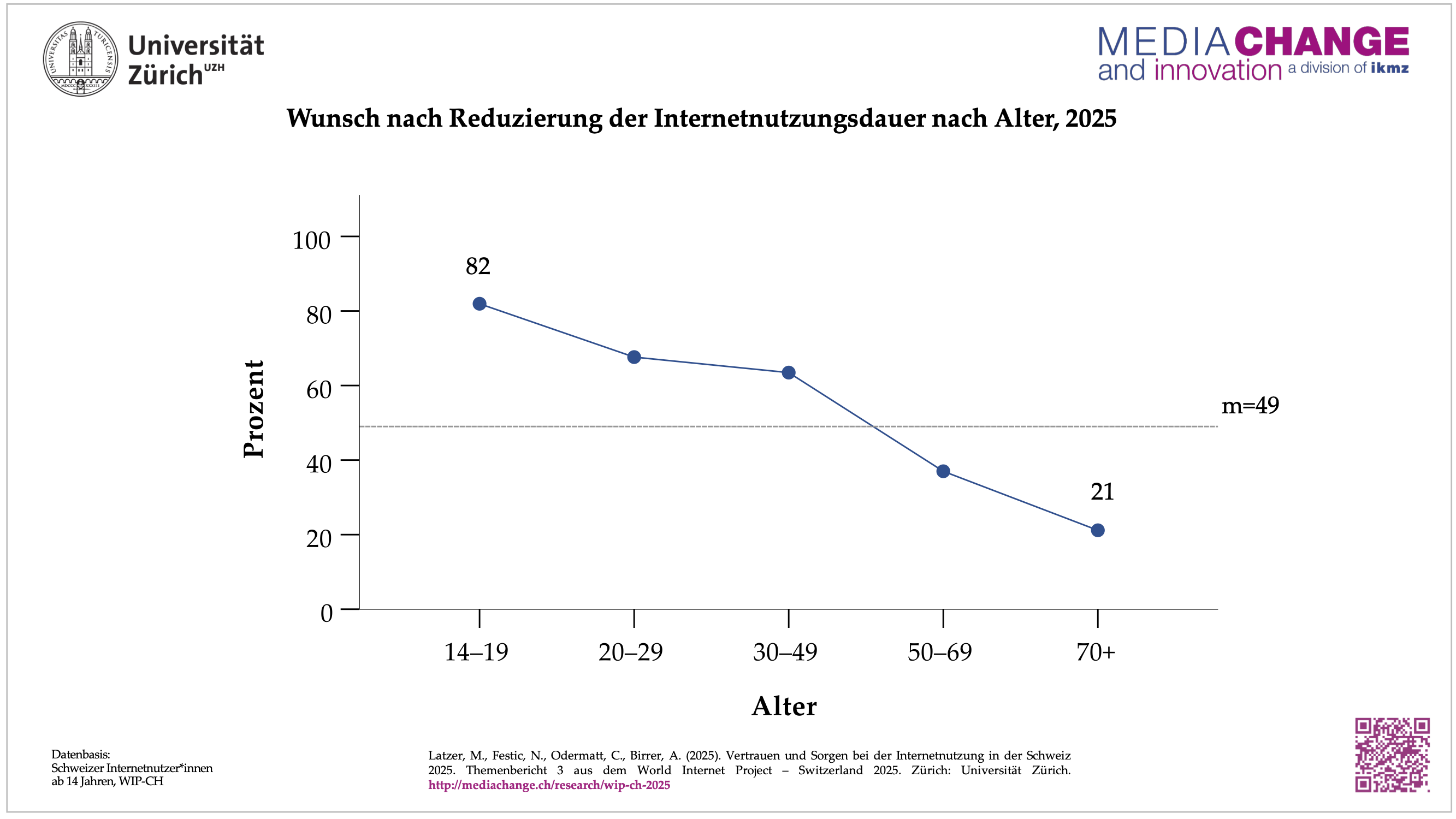 e Media Change & Innovation Division is the Swiss country partner of the World Internet Project (WIP). This international, collaborative project is looking at the social, political and economic impact of the Internet and other new technologies. The project started in 1999 and is chaired by Prof. Jeff Cole from the Annenberg School Center for the Digital Future, University of Southern California (USC), Los Angeles. The consortium includes more than 25 partners in countries and regions all over the world. The WIP conducts detailed, international comparative longitudinal studies on the use and impact of the Internet, publishes national and international reports and holds annual conferences. Results of the WIP-CH 2025 are based on an online survey with a representative sample of Swiss internet users aged 14 and over.